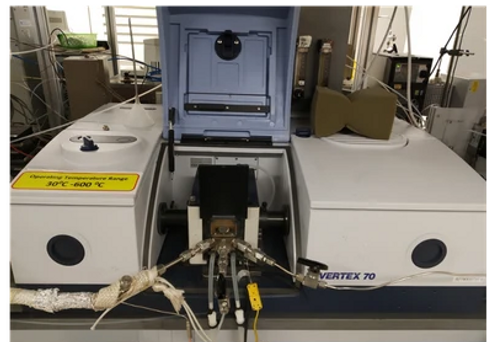 Bruker Vertex system with Harrick Praying Mantis cell for ex-situ and in-situ FTIR measurements.
